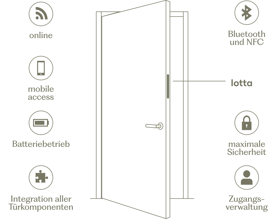 Lotta kombiniert Cleverness und Smartness in einer anwenderfreundlichen Lösung. Bewohner und Mitarbeiter können mit der lotta-App auf ihrem Mobilgerät oder einem Badge einfach und schlüssellos Zutritt erhalten. Die Integration des lotta doorcontrol erfolgt kabellos im Türblatt, ohne dass zusätzliche Installationen oder Sender benötigt werden. Dies gewährleistet höchste Sicherheit, da die Steuerung von außen nicht manipulierbar ist.